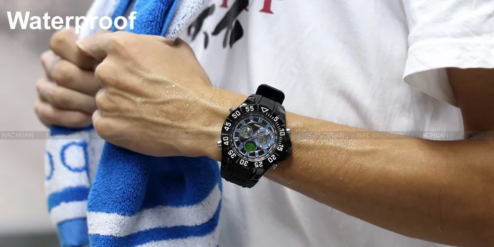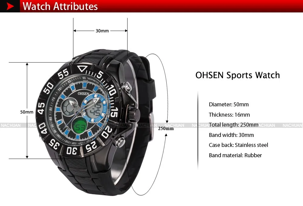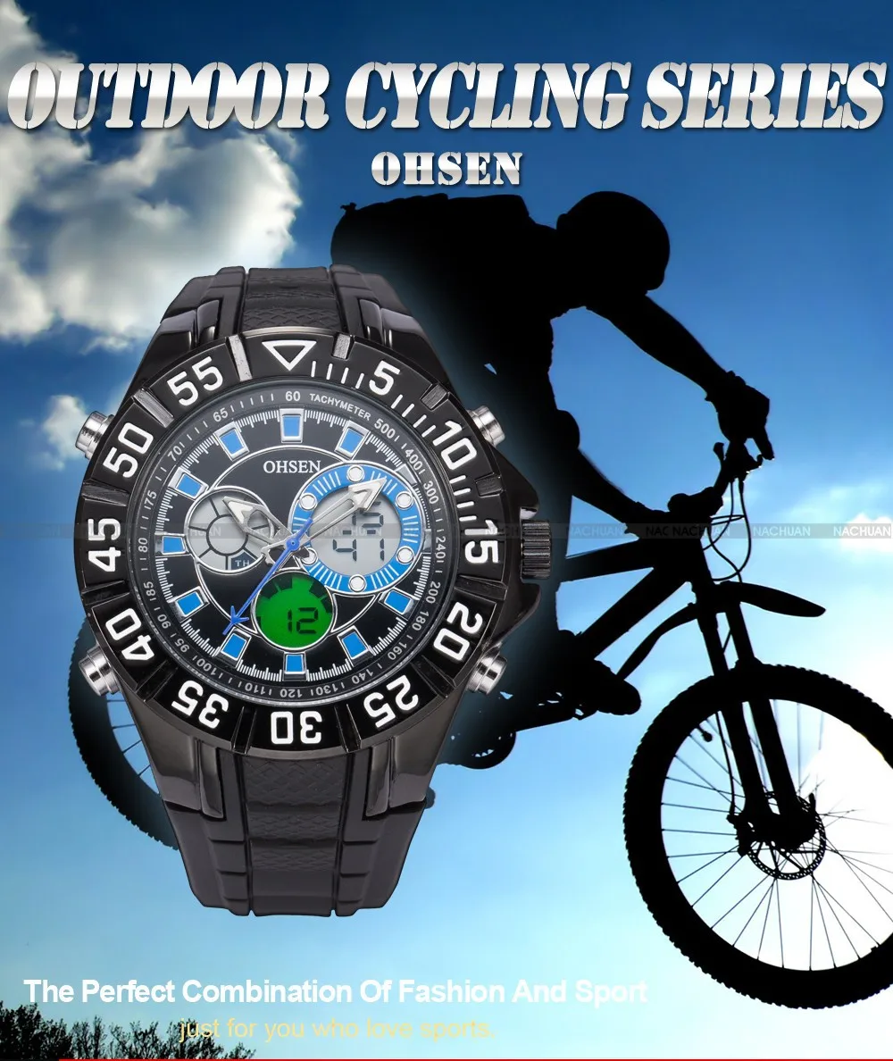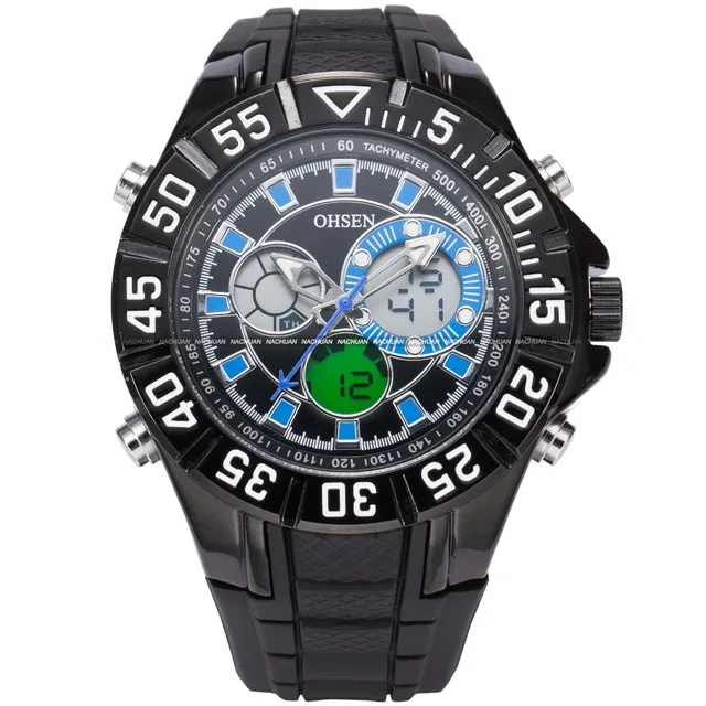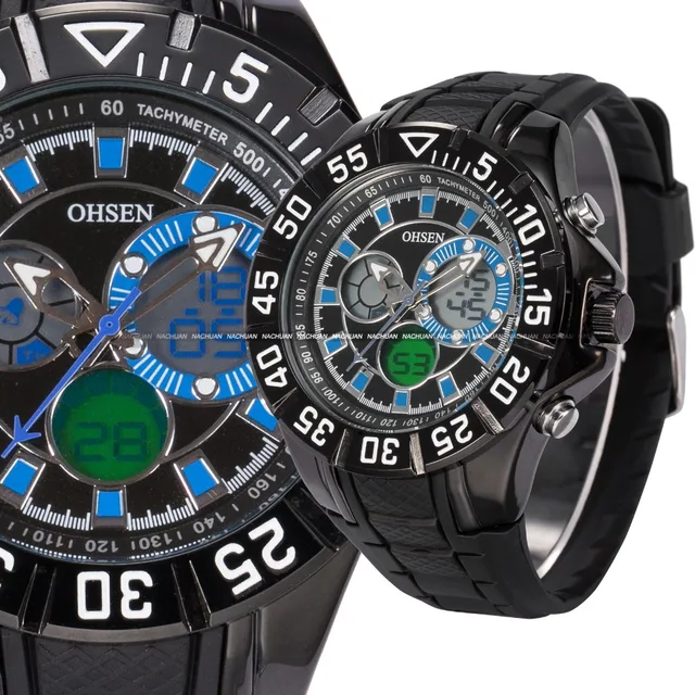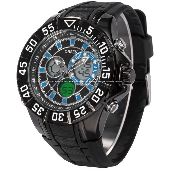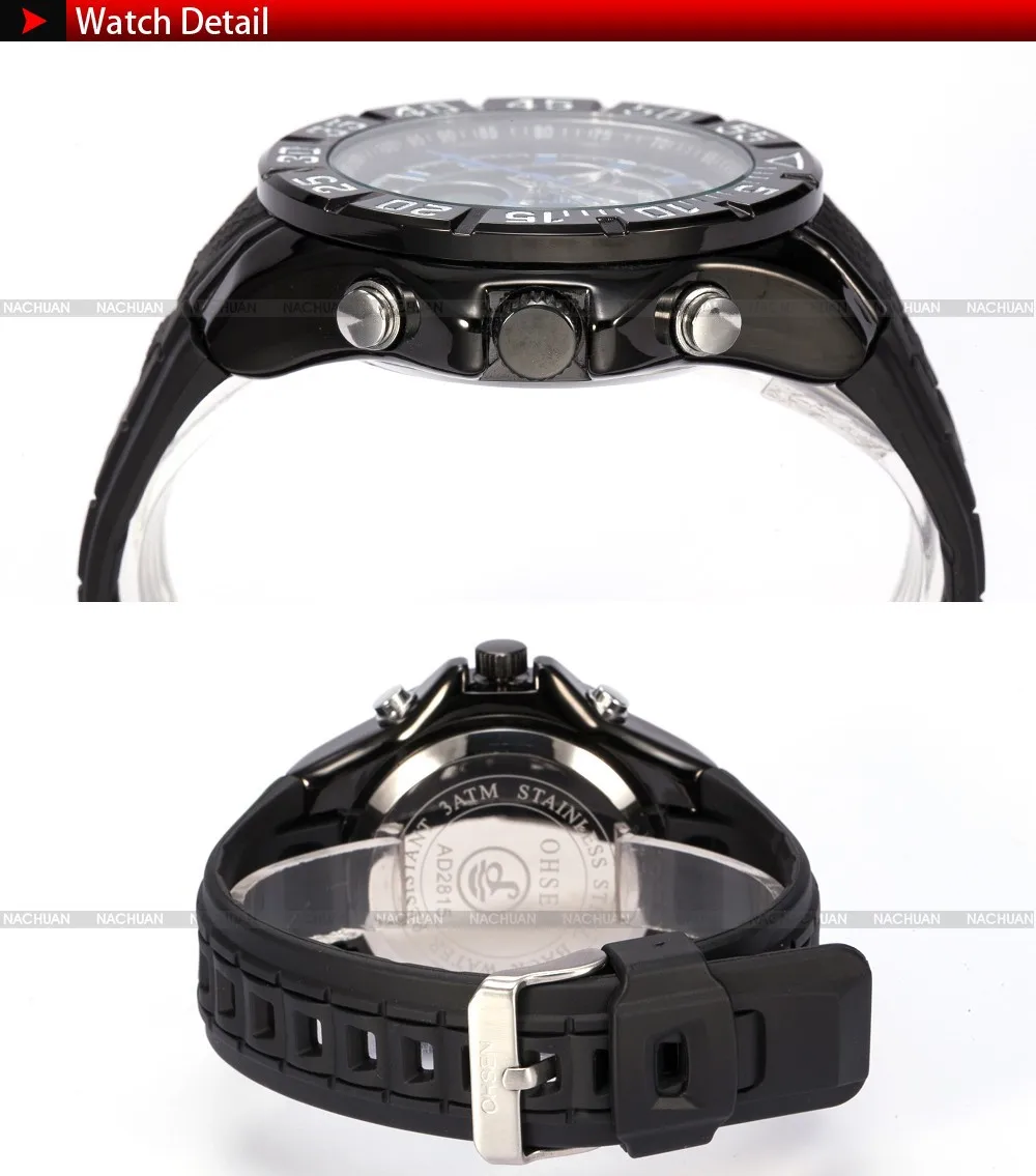 OHSEN 남성 블랙 블루 듀얼 시간 달력 알람 스톱워치 실리콘 석영 방수 montre 옴므 스포츠 디지털 LCD 시계/OHS228