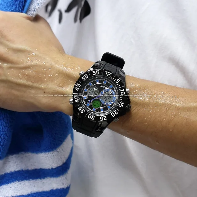 [해외] OHSEN 남성 블랙 블루 듀얼 시간 달력 알람 스톱워치 실리콘 석영 방수 montre 옴므 스포츠 디지털 LCD 시계/OHS228