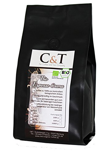 -. Binding : Misc. -. Brand : The Coffee and Tea Company -. EAN : 4260282273530 -. Feature : Würzig und kräftig, ein absolutes Muss für Crema-Liebhaber / Dieser Espresso ist besonders gut für Vollautomaten geeignet / Der Kaffee stammt zu 100 % aus kontrolliert biologischem Anbau / All unsere Kaffees sind wohl bekömmlich und wurden in einer 26 minütigen Langzeitröstung bei niedriger Temperatur von Meisterhand veredelt / DE-ÖKO-003 -. Label : The Coffee and Tea Company -. Manufacturer : The Coffee and Tea Company -. MPN : 17036 -. PackageQuantity : 1 -. PartNumber : 17036 -. ProductGroup : Grocery -. ProductTypeName : GROCERY -. Publisher : The Coffee and Tea Company -. Studio : The Coffee and Tea Company -. Title : BIO ESPRESSO CREMA - Kaffeebohnen 24 x 1000g gemahlen