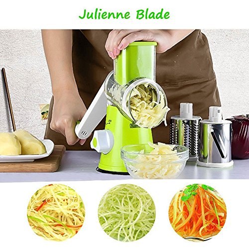 - Multiple methods: a slicing blade drums potatoes to 2" long shoestring fries, a small shredding blade tends to pulverize and make them mushy, and large grater shredding blade works well for making slaw with cabbage, zucchini, and carrots