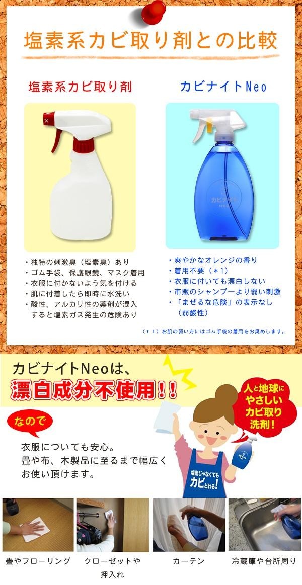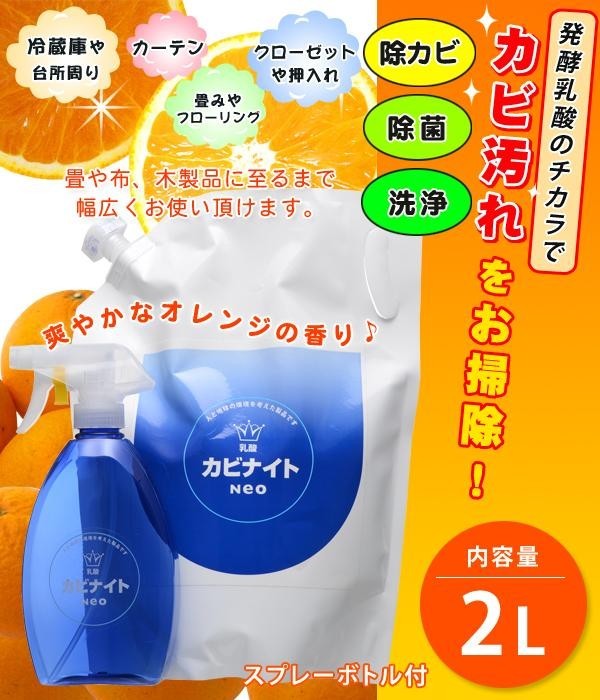 | 塩素じゃなくてもカビが落ちる!!発酵乳酸の働きで、カビを退治。塩素を使ってませんから、塩素が苦手なお客様にもお使いいただけます。畳・カーテン・フローリング・クローゼット・靴箱・窓にも使えるので、カビナイトNeoだけで家中お掃除できます!! |