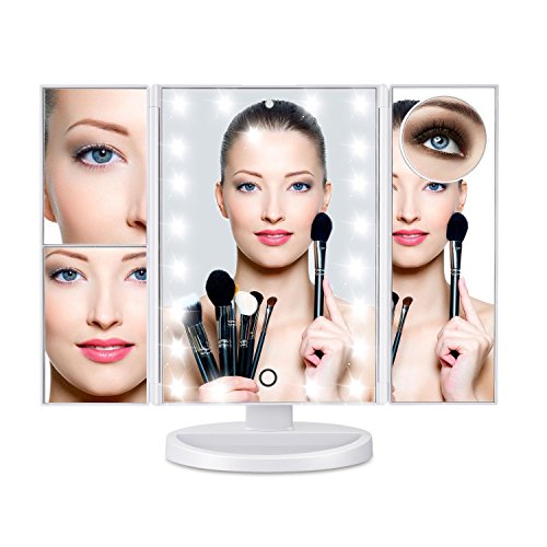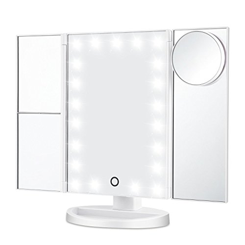 Led Lighted Makeup Mirror 10X 3X 2X 1X Magnifying Mirror 24 LED Tri-Fold Mirror with Touch Screen and 180° Adjustable Stand, Brightness Travel Beauty Mirror (White)