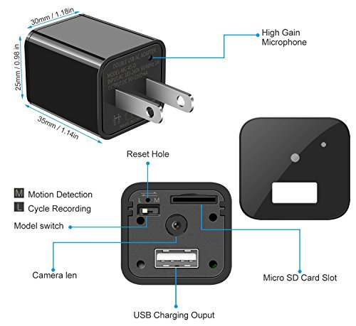 -. Feature : ✔A SPY CAMERA with Motion Detection - HIDDEN No Visible PinHole - Wide Angle Views / ✔EASY TO USE-The camera is ready to be used out of box, it will start recording when you plug it into power socket, and it will automatically stop recording when you plug it out. Pretty easy to use it / ✔VIDEO LOOPING-When the memory is full, camera is programmed to overwrite the oldest video files after 6 hours. So you will never miss any important thing and always have the latest videos / ✔USAGE AREAS - Pet Camera , Baby Safety, Nanny and Maid Surveillance, Charger Adapter for Any USB Device / ✔100% SATISFACTION GUARANTEED - Shipped and serviced by Amazon with Prime available & MONEY BACK GUARANTEE