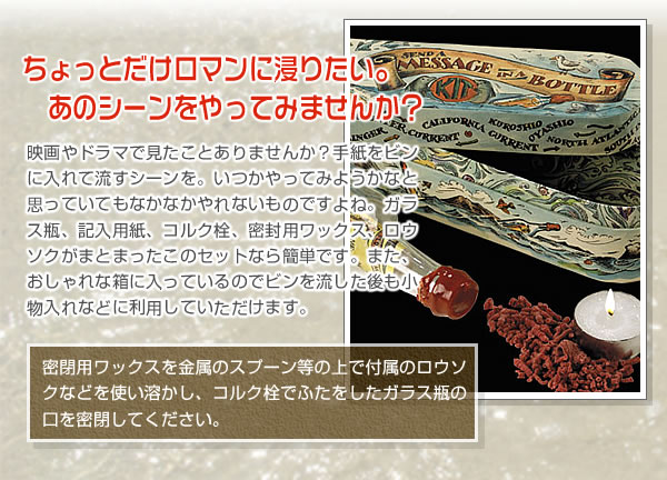 手紙をビンに入れて流すシーンを体験してみませんか?ガラス瓶、記入用紙、コルク栓、密封用ワックス、ロウソクがまとまったこのセットなら簡単!あなたの想い、海に流してみませんか?