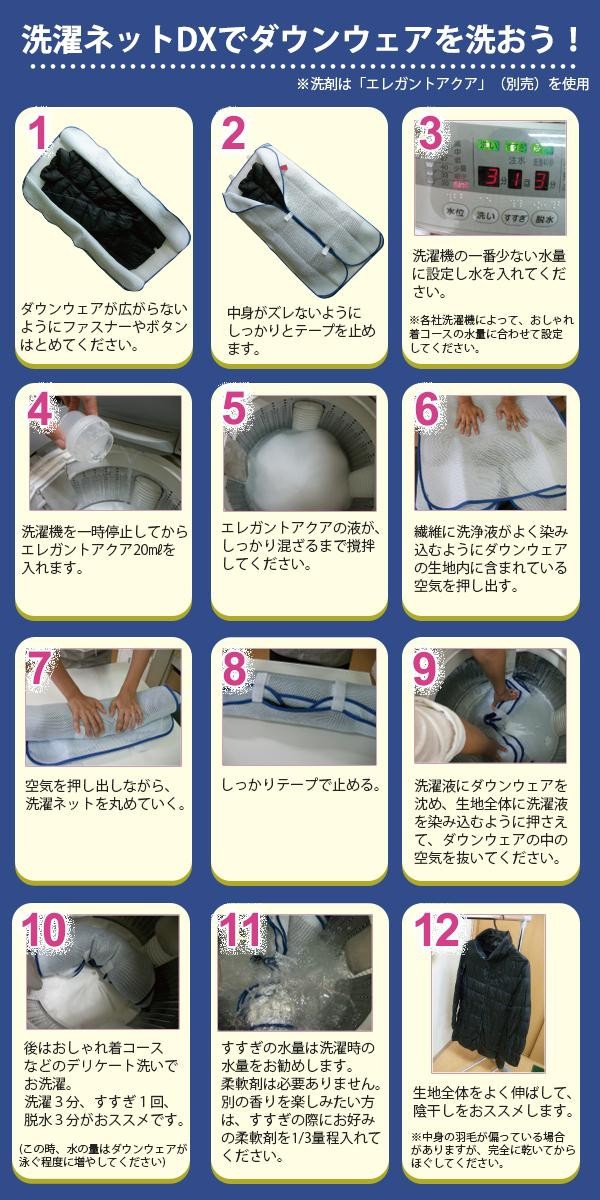 | 洗濯機でのおしゃれ着洗いに大活躍!!袋状の洗濯ネットに入れると、ネットの中で洗濯物が偏ったり、ダンゴ状態になりやすいですが、洗濯ネットDXなら洗濯物をたたんだ状態でお洗濯ができるので、縮みやシワを防ぐことができます。2通りの使用方法(三つ折・グルグル巻き)ができ、全自動型・ドラム式のどちらの洗濯機にも対応しています。ダウンジャケット等、少し大きめの衣類に最適です。 |