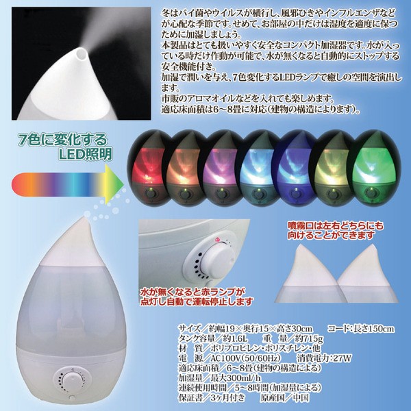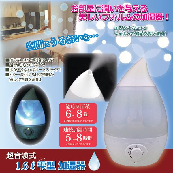 【商品名】超音波式加湿器 【1.6L雫型/6~8畳向け】 安全機能/7色LEDランプ付き