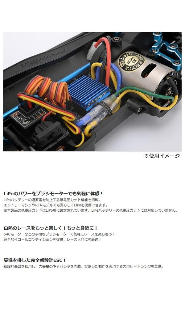無線操縦機用カスタムパーツです。LiPoバッテリーの過放電を防止する低電圧カット機能を搭載。完全なイコールコンディションを提供、レース入門にも最適!妥協を排した完全新設計ESC。 |