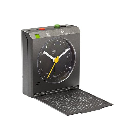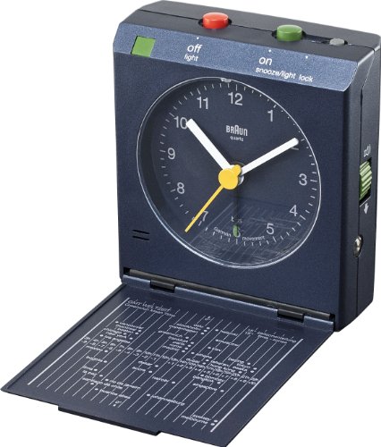 Braun Flip-Cover Analog Alarm Clock. Braun Alarm clocks have a reputation of being functional, reliable and very nice to look at. Back by popular demand, the classic clocks are largely re-editions of the favorite older styles: this alarm clock is truly a classic. With a cover to protect the clock in the suitcase, it features a time zone map of the world, a motion activated snooze, and a continuous light-on function allowing the clock to be used as a flashlight to help you make your way around an unfamiliar new place. This well-crafted clock features an on/off button with locking mechanism. Materials: ABS Plastic. Product Dimensions: 3.1" L x 2.8" W x 1.2" H. Weight 0.40 lbs.
