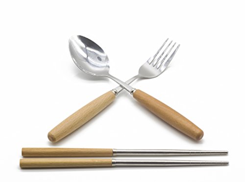 Genubi-3PCS Portable Flatware Spoon Fork Chopsticks Tableware Set 410 Stainless Steel Dinnerware Silver with Travel Box