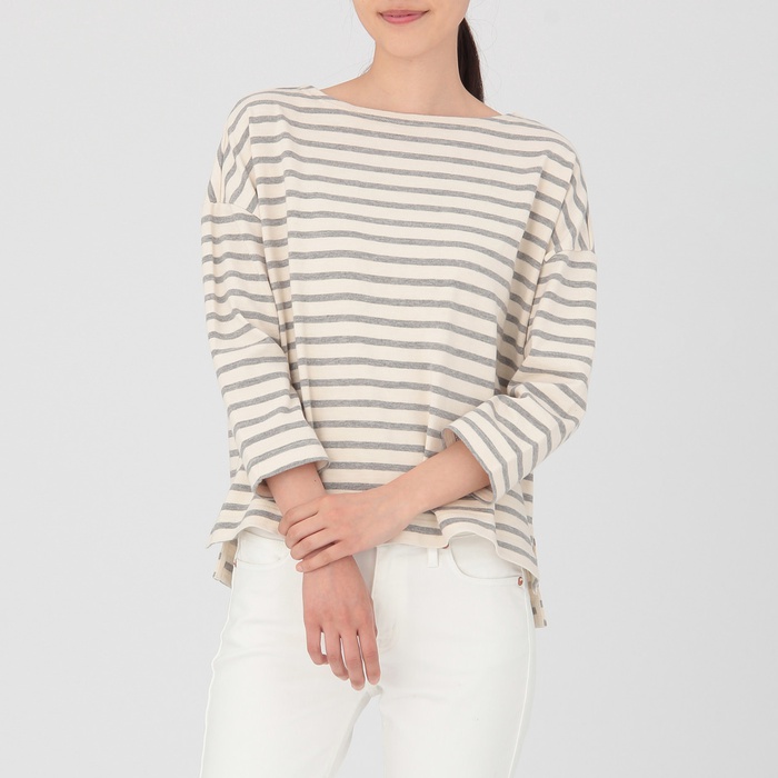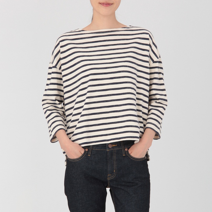 Muji 오거닉 코튼 보더 드롭 숄더T셔츠(보트 넥) 부인XS~S생성×네이비 편의점 수취가