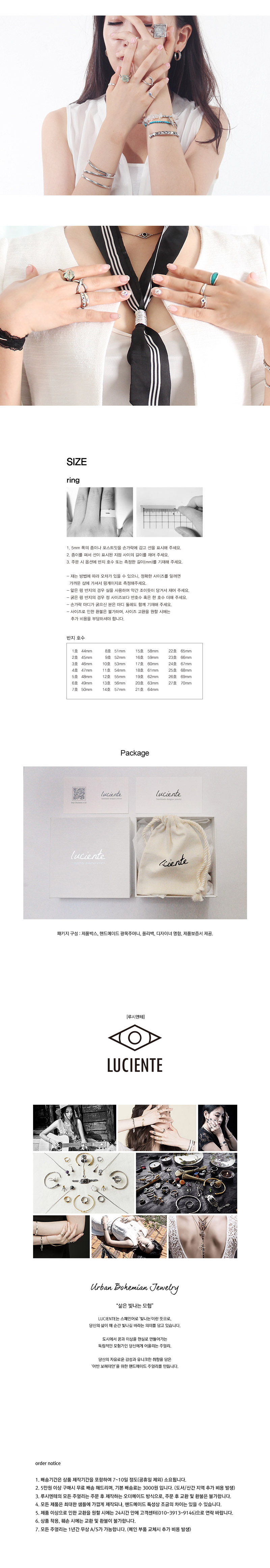 - 주문시 유의사항 : order notice 1. 배송기간은 상품 제작기간을 포함하여 7~10일 정도(공휴일 제외) 소요됩니다. 2. 5만원 이상 구매시 무료 배송 해드리며, 기본 배송료는 3000원 입니다. (도서/산간 지역 추가 비용 발생) 3. 루시엔테의 모든 주얼리는 주문 후 제작하는 오더메이드 방식으로, 주문 후 교환 및 환불은 불가합니다. 4. 모든 제품은 최대한 샘플에 가깝게 제작되나, 핸드메이드 특성상 조금의 차이는 있을 수 있습니다. 5. 제품 이상으로 인한 교환을 원할 시에는 24시간 안에 고객센터(010-3913-9146)으로 연락 바랍니다. 6. 상품 착용, 훼손 시에는 교환 및 환불이 불가합니다. 7. 모든 주얼리는 1년간 무상 A/S가 가능합니다. (메인 부품 교체시 추가 비용 발생)