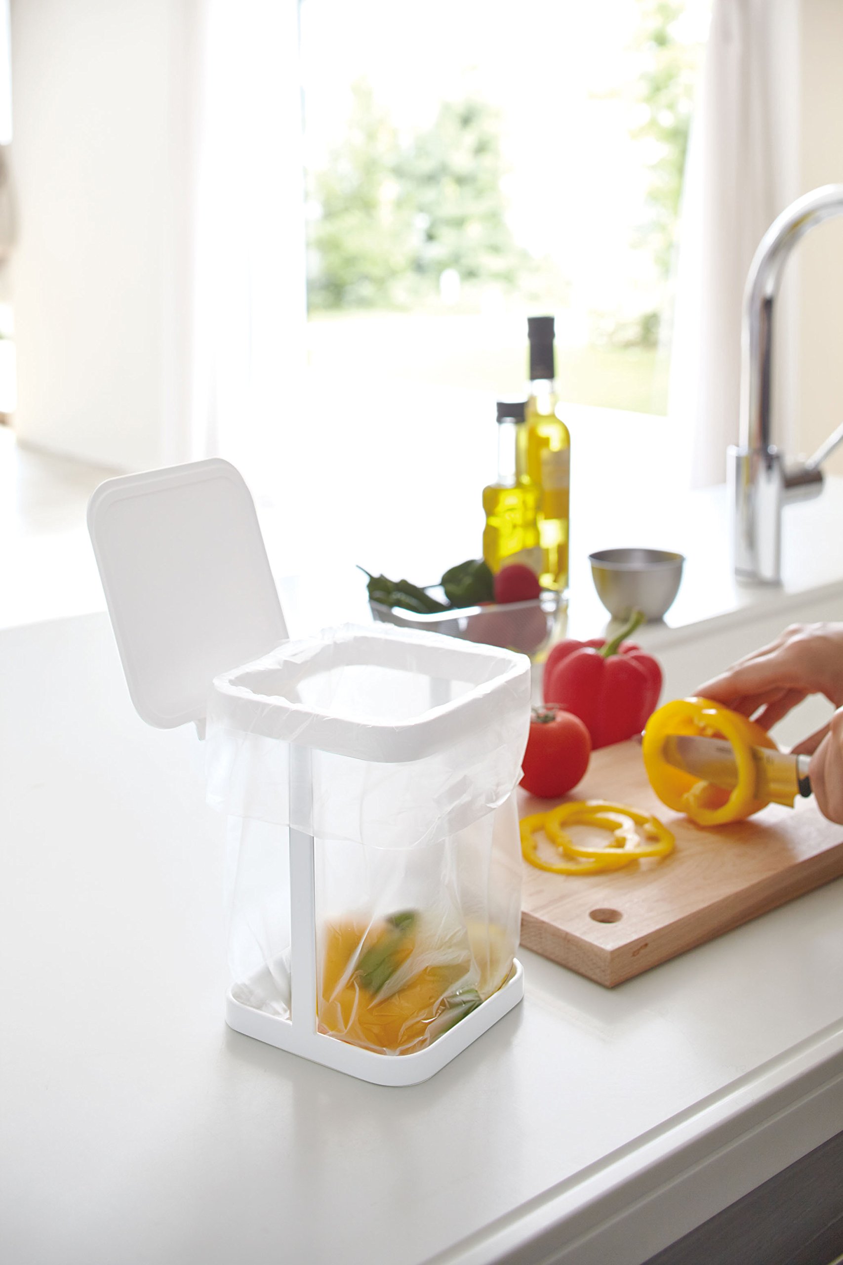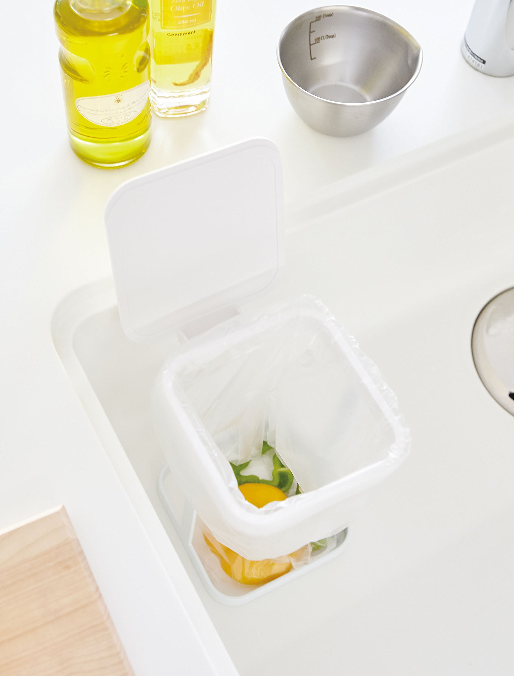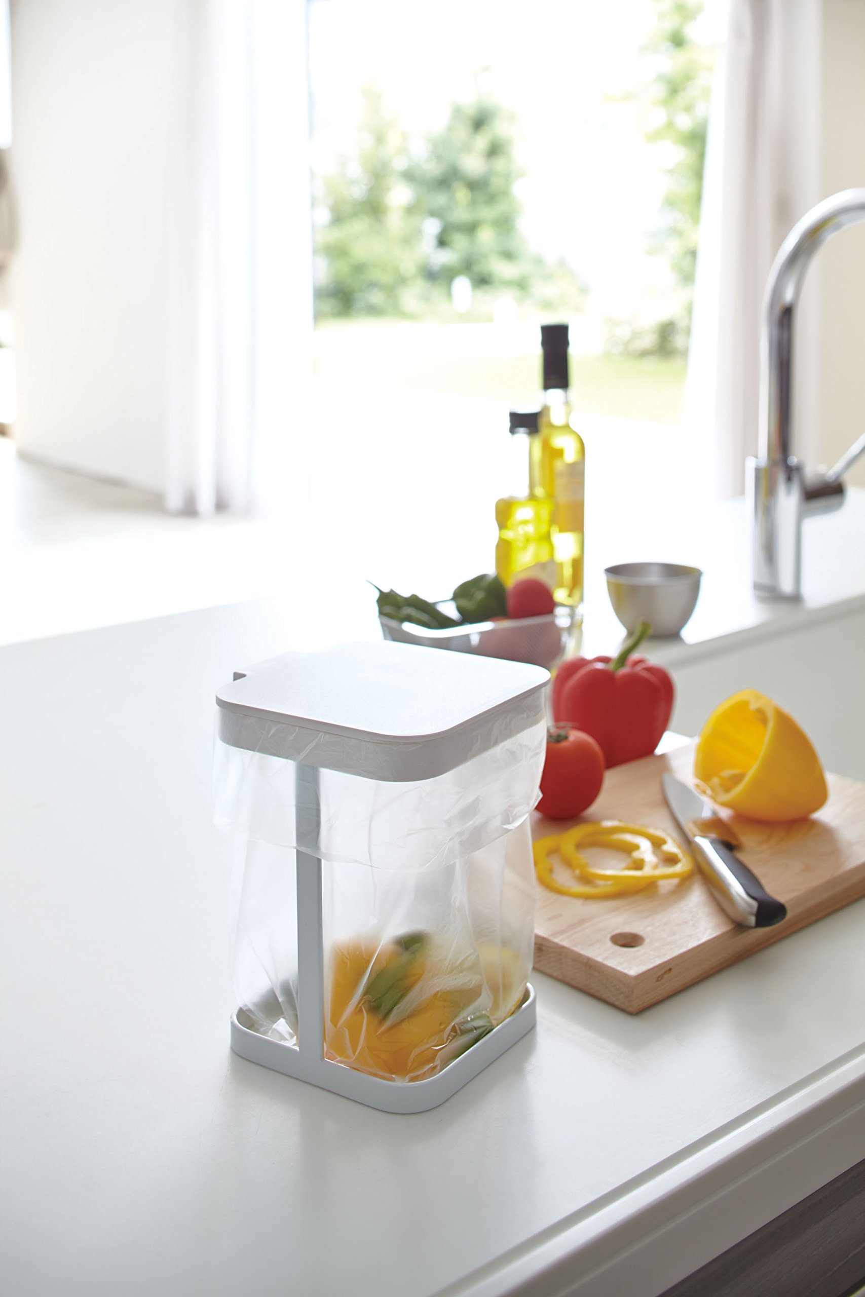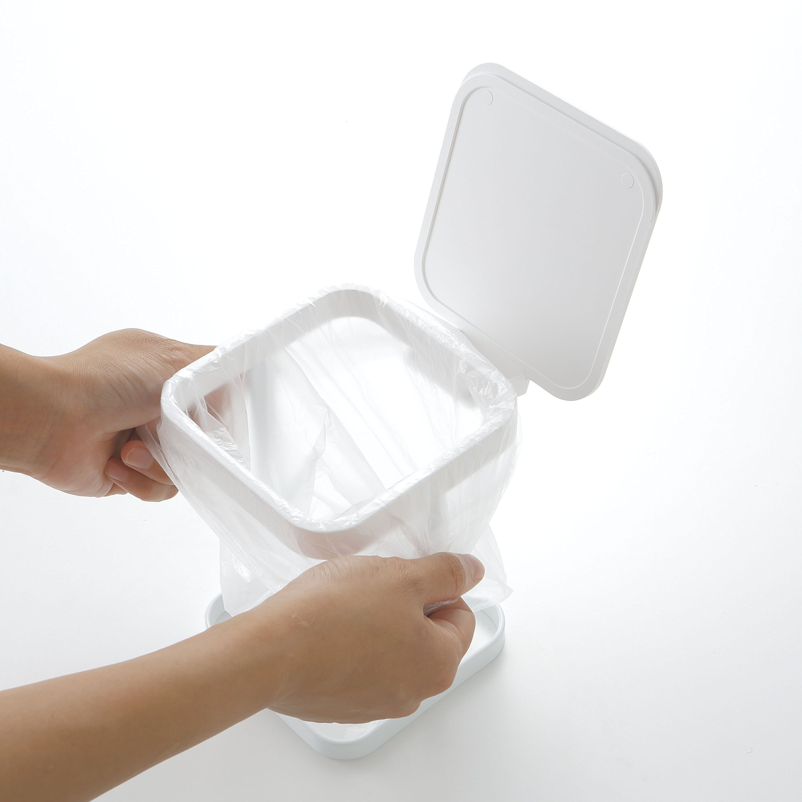 Opening the lid and hitting a plastic bag will make it a simple trash can. Compared with the same Yamazaki practice, a type with no lid (type with 4 legs extending upwards and hooking plastic bags), packed with watery things, big ones (vegetable core etc ...)) Sometimes garbage bags are pulled down, they are easy to disengage and distort. I think that it is better to have silicone slip and clip-like fasteners, but there is no such mechanism. If it is devised by oneself, is it about clamping from the bottom of the part to hang a plastic bag with a small flat laundry shears and holding it? If too much in the crowd, the disadvantage is that the plastic bag is caught on the pillar and it is difficult to take out when throwing away. When considering what to use in the kitchen, the merit of having a lid is very large compared with the type of four legs, but in terms of overall usability, it has advantages and disadvantages. I think that it is a very good product if you replace it with a short span in applications that throw away something finer.
