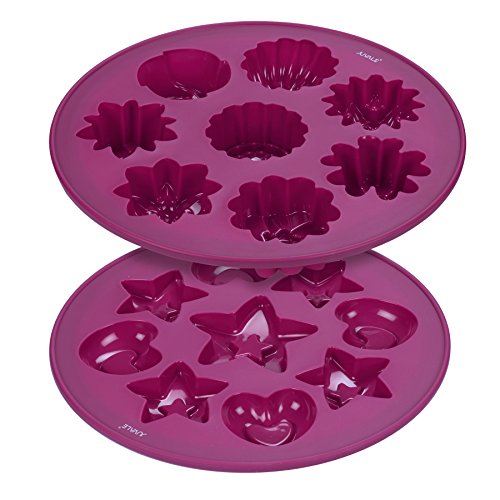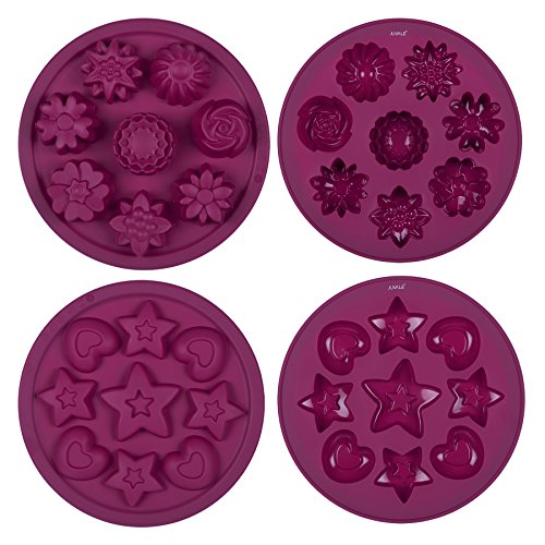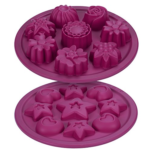 - BUNDLE SET: Pack of 2 non-stick, silicone, specialty and novelty baking pans for home-made cake, chocolate, candy, cookie, soap and more; includes 1x 8-Cup Flower Shape Mold and 1x 9-Cup Stars and Hearts Shape Mold.
