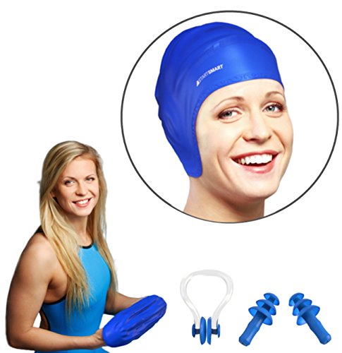 ✓ WHAT OUR CUSTOMERS SAY: "Excellent long hair swim cap!" "Everything you need in a single pouch!" "No more putting off exercise because I would have to wash/dry all this hair!" "Perfectly fits my thick curly hair". You could be our next 5 Star Review. ORDER YOURS TODAY and get FREE matching color nose clips and earplugs for an even more fun and fashionable swimming experience (value $9.95)