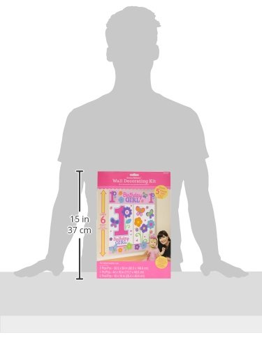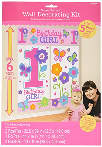 - Features 5-piece wall decoration says "1st Birthday GIRL" with butterflies, flowers and hearts with two smaller posters with "1st" headlines flank the middle birthday girl banner