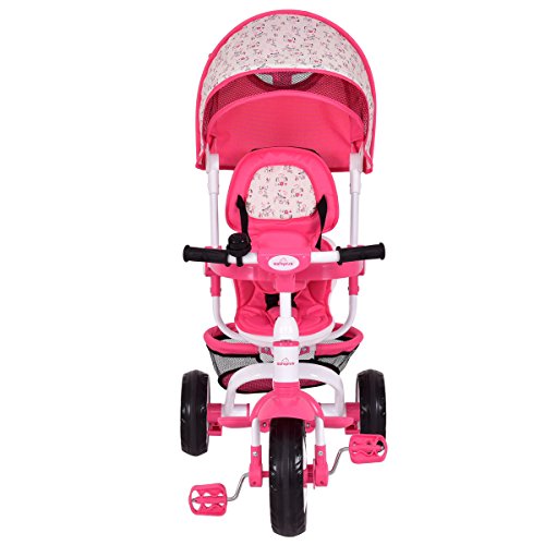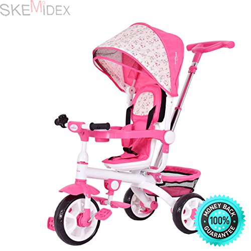 Studio : SKEMiDEX Publisher : SKEMiDEX Product Description ???????UNIQUE DESIGN! The push-handle and canopy could be removed for the convenient riding of older riders. The sturdy steel frame and adjustable seat ensure it will last for years. Don't hesitate to buy one for your kids! Brand new and high quality. Can be assembles in 4 ways according to your kid's age Removable canopy for UV protection High-back seat for comfort and safety★ ??EXCELLENT QUALITY! The 4-in-1 tricycle is the ultimate grow-with-me tricycle. It offers 4 ways to ride, to accommodate ages 10 months to 5 years: it easily converts from a stroller to a steering tricycle, learning-to-ride- tricycle, and finally a classic tricycle. The 4-in-1 tricycle features safety features for the youngest riders, including removable cushion with safety belt and wrap around safety tray with cup holder★ ??COMFORTABLE USE! Removable wrap around safety bars Multi Adjustable Push handle can control tricycle movement Back Foldable Footrest, Pedals become footrests for early stages Back storage basket Features with cup holder and bell Color: Pink★ ??FAST SHIPPING! Overall dimension: As picture shown Suitable Age from 10 months to 5 years old Front Wheel Diameter: 10" Rear wheel Diameter: 8" Weight Capacity: 55Lbs Weight Capacity of basket: 2.2lbs★ ?????GUARANTEE!You and all our clients have a 100% money back guarantee if any problems with the product occur.We'll Provide A 5 Star Experience, our world class customer service that's ready and available to address your concerns★ 0