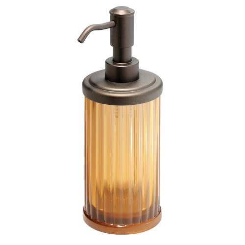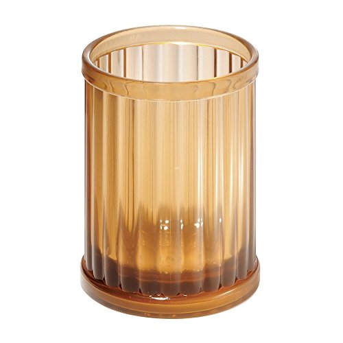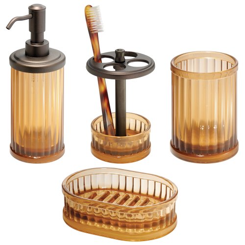 mDesign Bath Accessory Set, Soap Dispenser Pump, Toothbrush Holder, Tumbler, Soap Dish - 4 Pieces, Amber/Bronze