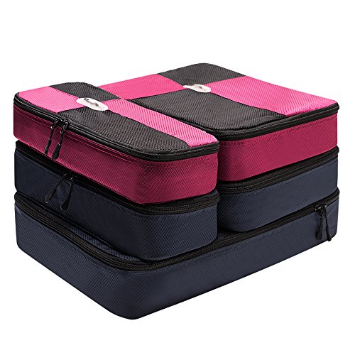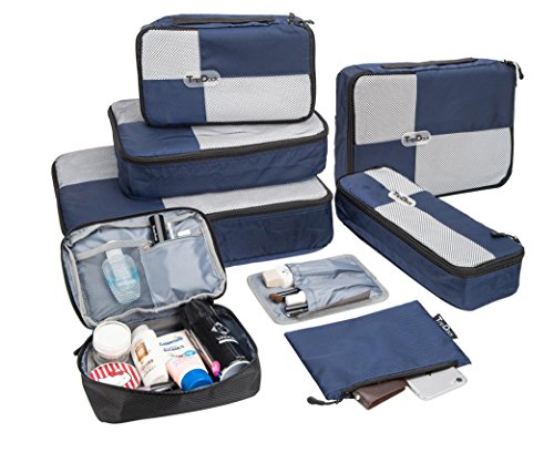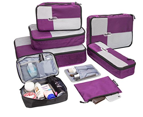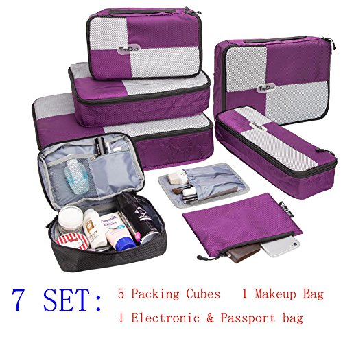 Different combinations: 5 SET (2 Slim, 2 Medium, 1 Large ); 6 SET (1 Slim, 1 Small, 1 Medium, 1 Large Cubes, 1 phone passport , 1 makeup bag) ; 7 SET (1 Slim, 1 Small, 2 Medium, 1 Large Cubes, 1 phone passport , 1 makeup bag) Plenty of storage size options for you (all sizes in inches): 1st cube - Large size - 17.5" x 12.75"x 4" - 1 pic 2nd cube - Medium size - 13.75"x 9.75" x 3" - 1 pics 3rd cube - Small size - 11"x 6.75"x 3" - 1 pic 4th cube - Slim size - 14"x 5"x 3" - 1 pic 5th Cube - Phone Passport - 8.9"x 6.1" - 1 pic 6th Cube - Makeup Organizer - 16.3"x 8.3"x 3.2" - 1 pic And there's zero risk when you buy today Using our packing cubes is the best way to organize things for your upcoming trip. To get the most out of them, just roll up your clothes (instead of folding them), and you'll be amazed at how much more you can fit in each cube. Not to mention, if you're traveling with someone, the packing cube system makes it super easy to separate each person's clothing into a different bag so you won't be left rummaging in the suitcase for what you need! And it makes your flight way easier with them in your carryon luggage There's nothing worse than being squashed in between seats, trying to wrestle things out of your onboard luggage (especially if you have kids demand iPads, sweets, and other toys!). Well, with these cubes, you can have all the flight essentials boxed off and ready to go in a second, without the usual hassle. In and out with no more stress! 0 |