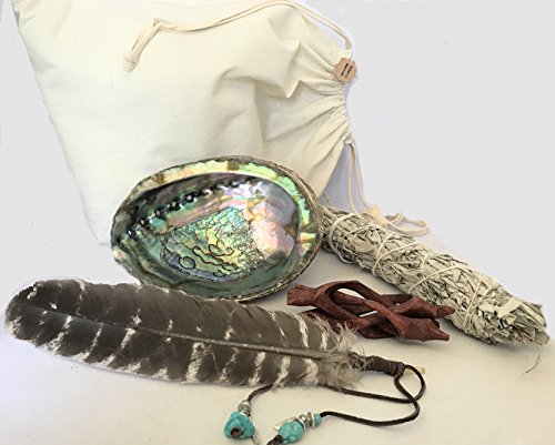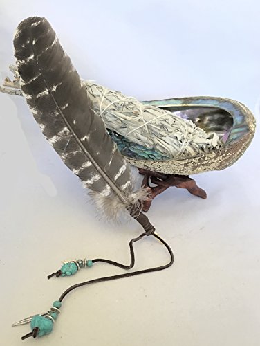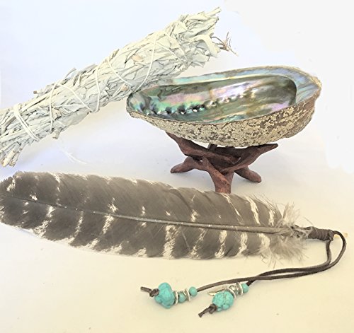 Lg Beautiful Premium Abalone Shell, Wood Cobra Tripod Stand, Lg White Sage Smudge Stick and a Hand Decorated Feather. Home Blessing and Cleansing Ritual Instructions. In a 12"x14" Reusable Muslin Bag