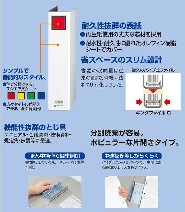 | とじ具と書類を一緒に引き抜けば、中途から抜き差しが簡単にできます。オフィスでの共有ファイルに適した厚型で、一般書類を大量に収納可能!! |