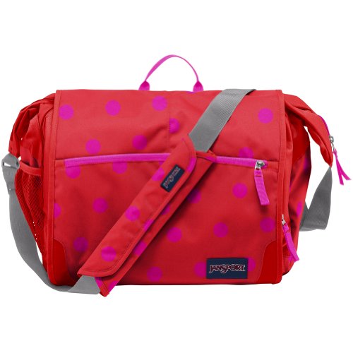 -. Title : JanSport Elefunk-Printed Laptop Messenger Bag - Fluorescent Pink/Coral Dusk Spots / 13"H x 16"W x 5.5"D