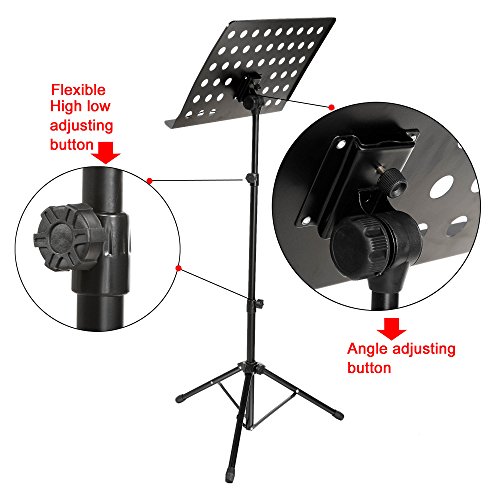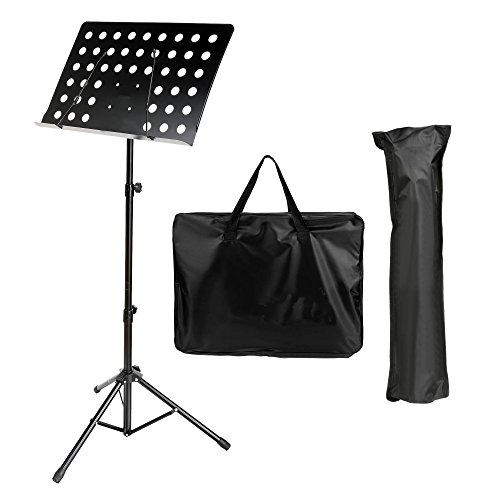 -. Brand : Binxin -. EAN : 0712755493319 -. Feature : Super Compact: The bookplate of the music stand measures 49 x 33.5 cm/ 19.1 x 13.1 inch (L x W) which is wider than other products on the market. It keeps the sheets more stable while looking stylish. / Ultra Adjustable:The stand is height adjustable(from 19.1 inch to 46.4 inch). It can swivel 360 degrees and tilt for the ease of use either sitting or standing. Adjustable height make it ideal both children and adults. / 2 SP.R.Ing Clips With Rubber Head: keep sheet music or scores in order.It is ideal when playing outdoors as it would hold the sheet music or scorer securely and preventing it from blowing away. / Metal Tripod Support: the Non-slip feet provides great support for the stand to stay firm. / Light&Portable: this sheet stand holder belongs to ultra-lightweight style, and a nice bag is used to carry and store so that you can show your wonderful performance anywhere. -. PackageQuantity : 1 -. ProductGroup : Musical Instruments -. ProductTypeName : INSTRUMENT_PARTS_AND_ACCESSORIES -. Title : Portable Adjustable Music Conductor Stand Sheet Black Metal with 2 Carrying Bags, Metal Holder, Black -. UPC : 712755493319