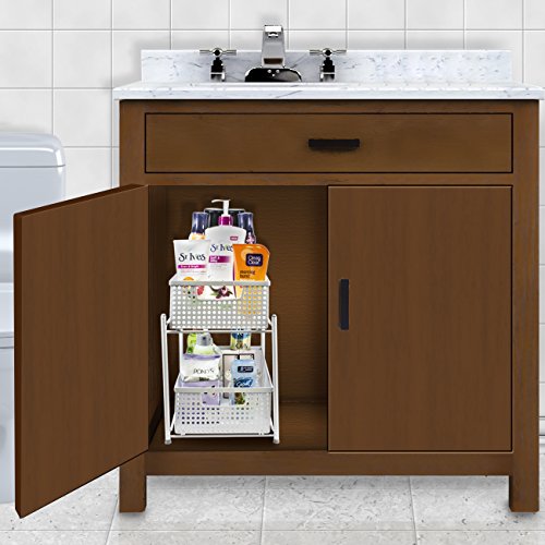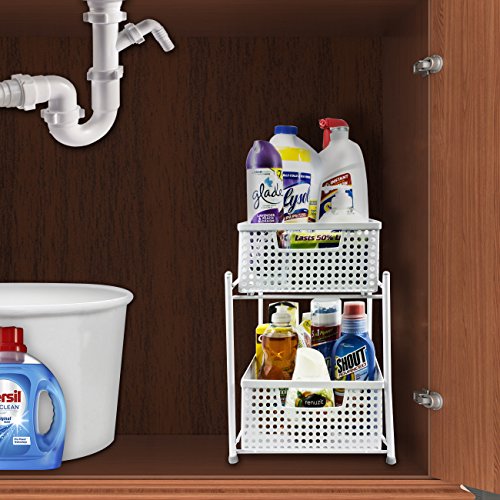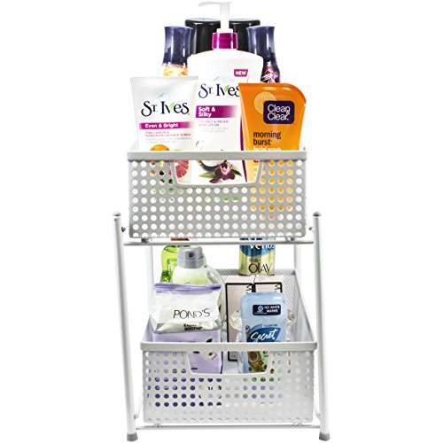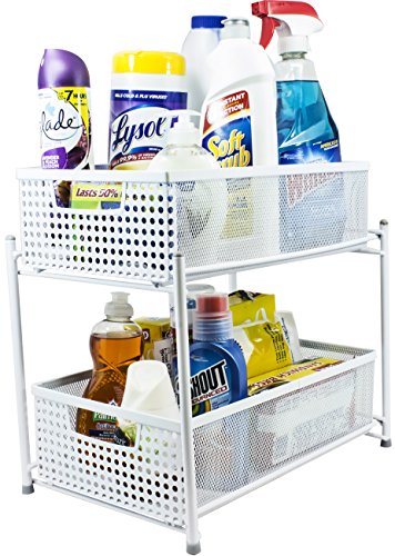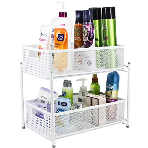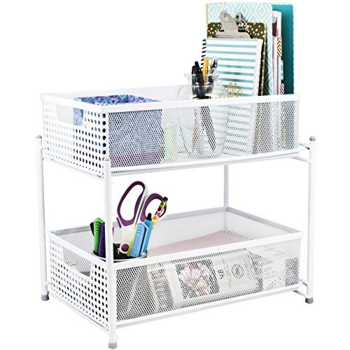- 2 TIER MESH ORGANIZER BASKETS (WHITE) — Organize and store a wide variety of items including kitchen utensils, toiletries, office supplies, cleaning products, crafting materials, accessories, and more— The convenient 2-level basket organizer stand maximizes small spaces with sliding drawers for easy access and stowing items when not in use