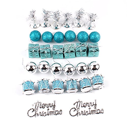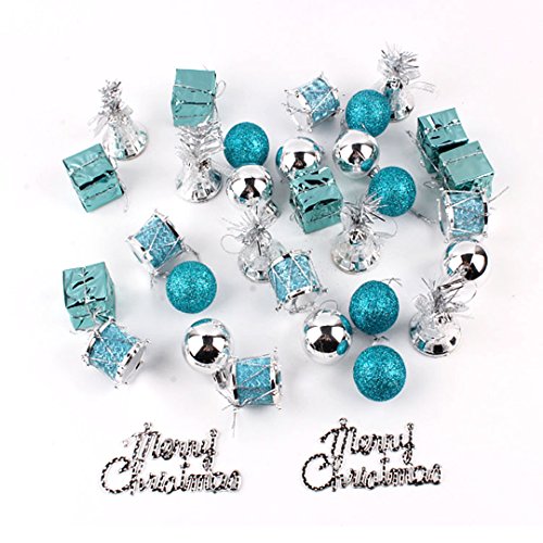 - Package: 6x shiny Silver balls, 6x Blue matte balls, 6x bells, 6x drums, 6x gifts, 2x "merry christmas" signs