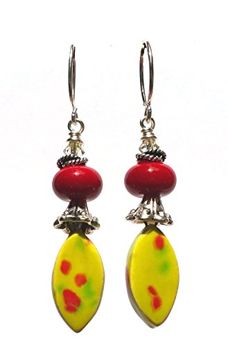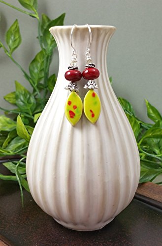 -. Title : 1 Pair of Dew Drops Earrings in Lime Green Ruby Red and Sterling Silver Lampwork Glass