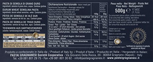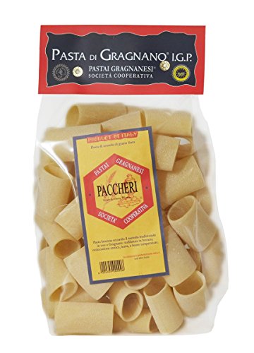 -. Binding : Misc. -. Brand : Pastai Gragnanesi -. Feature : 17.6 ounce (500 gram) - Plastic Packing - Pack of 3 / Ingredients: Durum Wheat Semolina and Water / IGP Protected - Protected Geografical Information / The Paccheri Pasta has a straight cut with deep lines on the surface and a diameter of 30 mm. The origin of this shape refers to the Neapolitan word "pacchero" or slap. / Product of Italy -. IsAdultProduct : 0 -. Label : Alma Gourmet -. Manufacturer : Alma Gourmet -. NumberOfItems : 3 -. PackageQuantity : 4 -. ProductGroup : Grocery -. ProductTypeName : GROCERY -. Publisher : Alma Gourmet -. Studio : Alma Gourmet -. Title : Paccheri Pasta di Gragnano 500 gr - Pack of 3