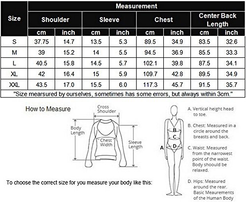 US S-----Shoulder 14.7"----Sleeve 5.3"----Chest 34.9"----Length 32.6" US M-----Shoulder 15.2"----Sleeve 5.5"----Chest 36.9"----Length 33.3" US L------Shoulder 15.8"----Sleeve 5.7"----Chest 39.8"----Length 34.1" US XL----Shoulder 16.4"----Sleeve 5.9"----Chest 42.8"----Length 34.9" US XXL---Shoulder 17.0"----Sleeve 6.0"-----Chest 45.7"----Length 35.7"Feature