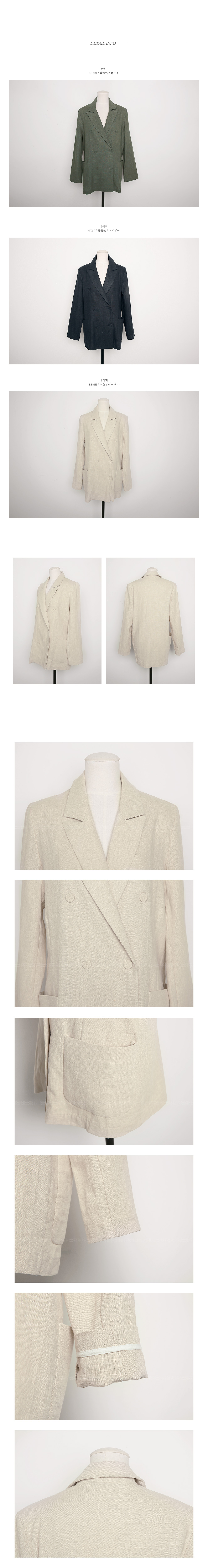 여유있는 핏감과 린넨소재로 편안하고 시원한 착용감을 선사해드리는자켓 아이템을 소개해드릴께요~^^더블버튼 디자인으로 세미캐주얼룩을연출하기에 알맞은 자켓이랍니다~린넨소재로 시원한 착용감을 선사해드려여름까지 즐길 수 있으며 여유있는 핏으로누구든지 편안한 착용감을 느낄 수 있어요~자칫 밋밋할 수 있는 디자인이지만 프론트 밑단 양쪽으로 빅포켓을 더해주어 한층 더 활동적인 분위기가 느껴진답니다~