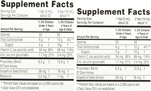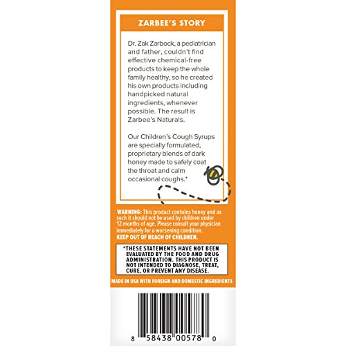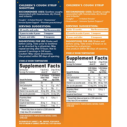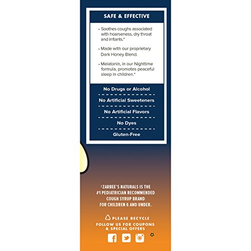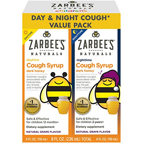 ReleaseDate : 2017-06-16 Studio : ZarBee's Publisher : ZarBee's Binding : Health and Beauty Product Description Zarbee's Naturals Children's Cough Syrup Day Night Value Pack is a safe and effective way to soothe kids' coughs associated with hoarseness, dry throat, and irritants.* This convenient value pack of wholesome daytime and nighttime cough syrups features a specially formulated proprietary blend of natural dark honeys with vitamin C and zinc for immune support.* The nighttime formula includes melatonin, a non-habit forming and drug-free ingredient, to promote peaceful sleep* in children. Founded by a pediatrician and father looking for a healthy and chemical-free alternative for his family, this cough syrup is made with carefully sourced, wholesome ingredients, with no artificial flavors, artificial sweeteners, drugs, alcohol, or dyes. It is gluten-free and pediatrician-recommended as a daytime formula for children 12 months , and a nighttime formula for children 2 years .