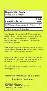 Promise DHA provides 100% of the omega-3 DHA you and your baby need during each stage of pregnancy. This completely pure, pharmaceutical-grade oil, is tested to ensure it's safe and free from impurities including mercury. Promise DHA provides 275mg of DHA in only one strawberry-flavored soft gel per day.