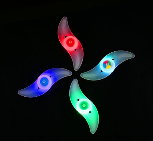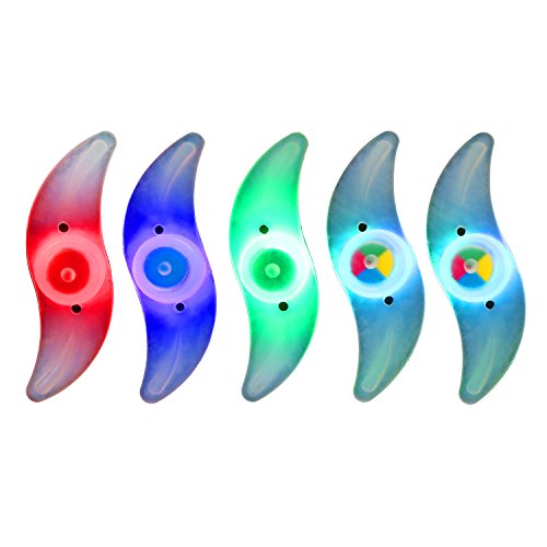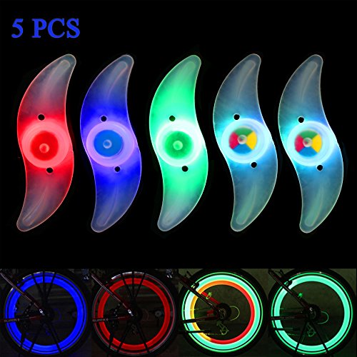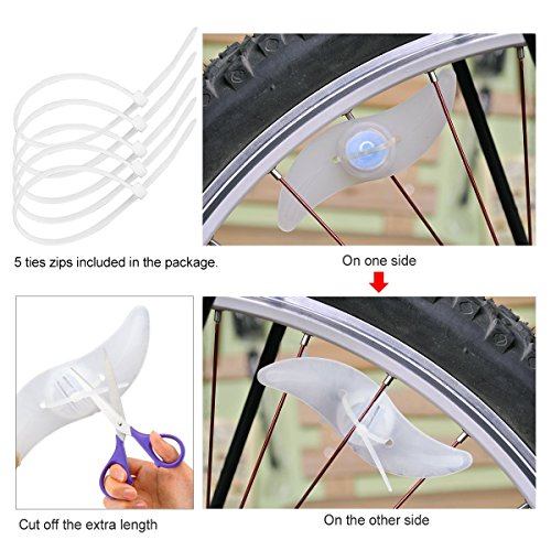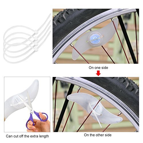 6. Installation tips: Each bike LED light has two holes, you can use a rope to tie them on your bicycle spokes. Product Parameters: * Quantity:5 pcs * Color: Red, Blue, Green, 2 Colorful * 3 modes: Flash Steady, Flash Quickly, Flash Slowly. * Powered by 1 button batteries (INCLUDED) Suitable for all kind of the Φ2mm spokes bikes.