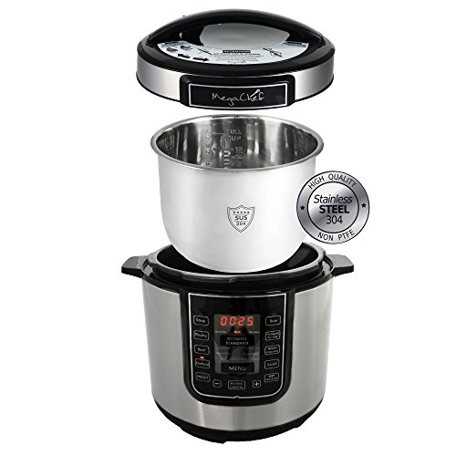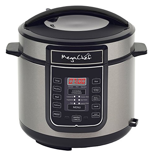 Studio : MegaChef Publisher : MegaChef Binding : Kitchen Product Description MegaChef 6 quart digital pressure cooker with pre-set multiple function features reduces cooking time up to 70%. You can easily program your pressure cooker or use some of it's per-programed selections. 14 pre-set menu buttons let you cook faster than conventional oven on the high pressure setting, or slow cook up to 9.5 hours. 0