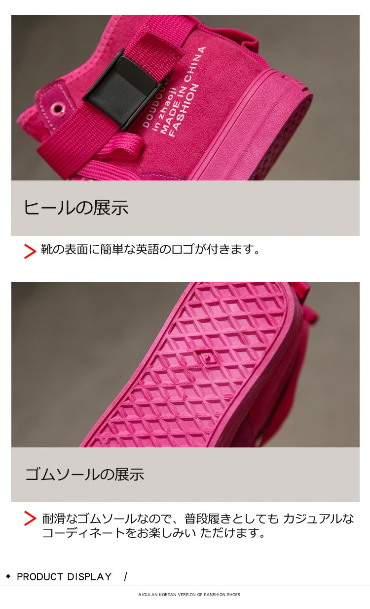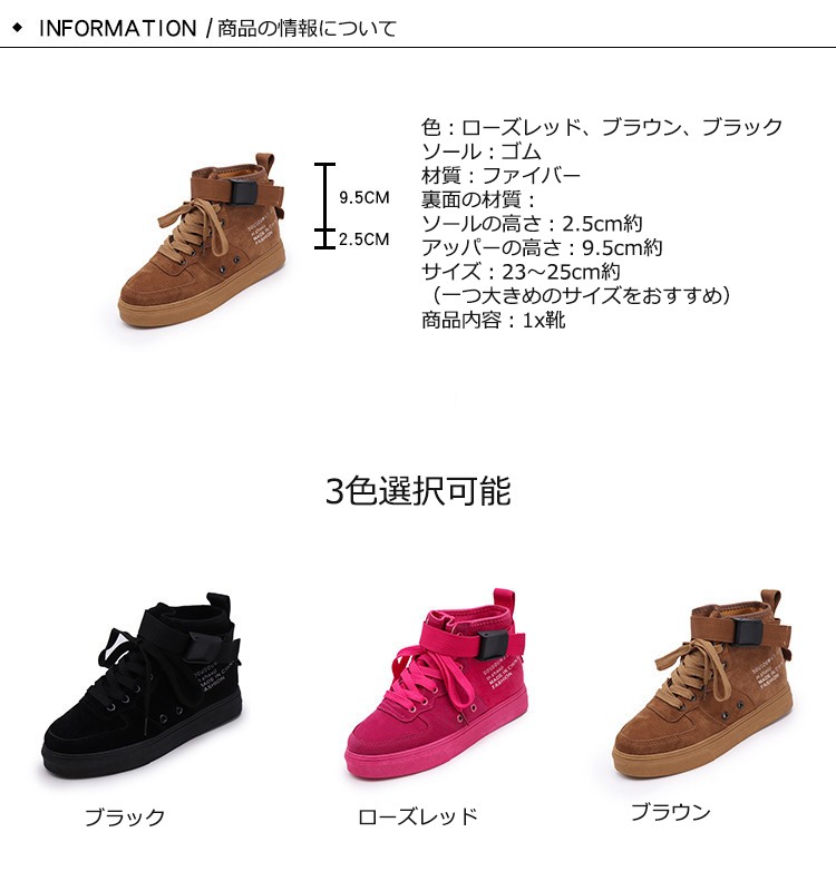 色:ローズレッド、ブラウン、ブラックソール:ゴム材質:裏面の材質:ソールの高さ:2.5cm約アッパーの高さ:9.5cm約サイズ:23~25cm約(一つ大きめのサイズをおすすめ)商品内容:1x靴EU36=22.5cm EU36=23cm EU37=23.5cm EU38=24cm EU39=24.5cm EU40=25cm 注意:※ サイズなど、商品詳細を必ずご確認後、ご了承頂いた上でご購入をお願いします。また、採寸方法違いにより、0.5~1cmの誤差がございますので、ご了承ください。特徴:【軽量、通気性よい】ゴムのソールとキャンパスの材質でスポーツシューズならではの軽さを実現し、通気性もよいです。どんな季節でも着用します。 軽量なので、ランニングや歩くや他の運動が易くになりました。【ファッションな配色】ファッションな配色で、シューズがファッションになり、女性に最適です。中学生などに通学靴としてもよい選択です。 【ゴムのソール耐滑】柔らかい材質で作って、ゴムのソールので、耐滑のです。スムーズな足運びをサポートします。球技や他の運動にもスムーズになりました。【利用場合】スポーツだけでなく、通勤や通学やアウトドア、普段履きとしても カジュアルなコーディネートをお楽しみい ただけます。