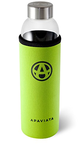 Premium Glass Water Bottle by APAVIATA - Premium 18 ounce Leak-Proof Glass Bottle with Gray Neoprene Insulating Sleeve & Stainless Steel Cap.