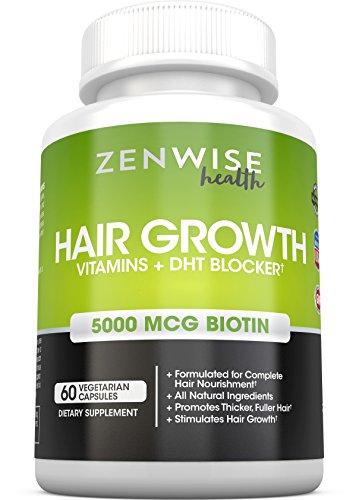 -. Binding : Health and Beauty -. Brand : Zenwise Health -. IsAdultProduct : 0 -. ProductGroup : Health and Beauty -. ProductTypeName : HEALTH_PERSONAL_CARE -. Title : Hair Growth Vitamins Supplement - 5000 mcg Biotin & DHT Blocker Hair Loss Treatment for Men & Women - 1 Month Supply With Vitamin A & E to Stimulate Faster Regrowth + Care for Damaged Hair