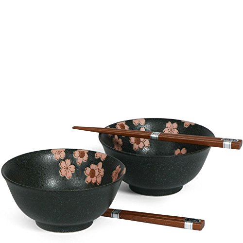 Miya Japan Black Sakura Cherry Blossoms Set of 2 Noodle Bowls and Chopsticks