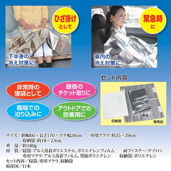 【商品名】防寒シュラフ/寝袋 【専用枕付き】 アルミ蒸着タイプ 繰り返し使用可 マチ付き セルレット(R) 〔災害時 非常用 アウトドア〕