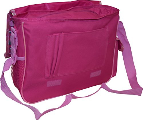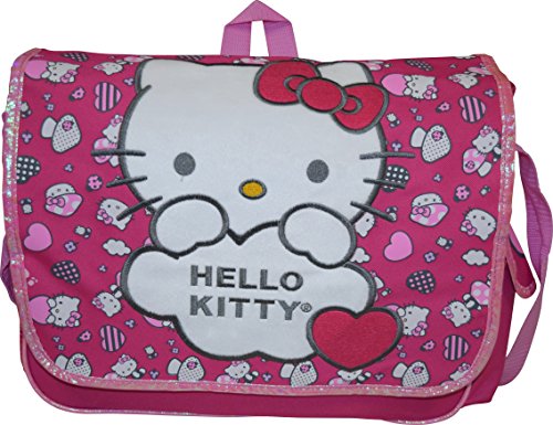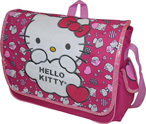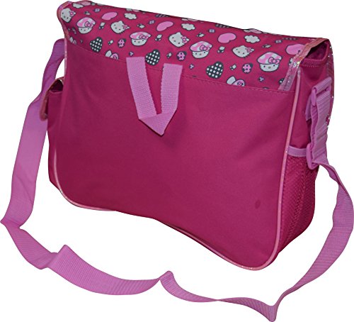 -. Brand : Hello Kitty -. Color : Pink -. Department : girls -. EAN : 0700118155554 -. Feature : Made of an easy to clean and very durable polyester / Flap over closure with velcro. Main compartment with zipper closure / Features gorgeous Hello Kitty embroidery with plush and stunning printing on front. Reflective pvc trimming / Small organizer under the flap. Single shoulder strap with adjustable length system / Messenger bag dimensions: 12"H x 14"W x 4"D -. ProductGroup : Apparel -. ProductTypeName : LAGE -. Size : Large -. Title : Hello Kitty Sanrio 14" Embroidered Face Messenger Bag -. UPC : 700118155554