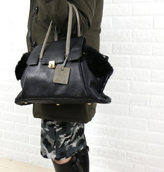 素材:表地・ハンドル:やぎ革、付属:牛革、毛皮部分:羊毛皮、裏地:綿100%