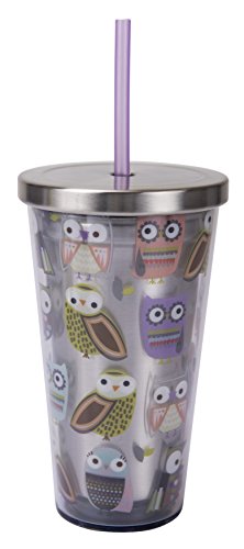 Boston Warehouse Stainless Steel 16-Ounce Tumbler Travel Cup with Lid and Straw, Patterned Owls