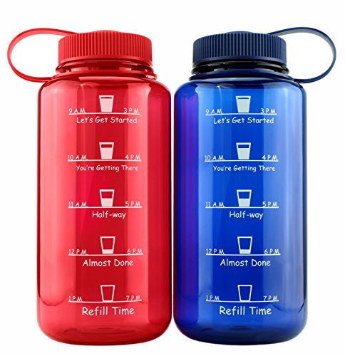 Timed Water Bottles 32-Ounce Combo Pack (2-Pack, Blue / Red); Time Marker Tracker Goal Sports Bottles, Non-Toxic BPA-free Tritan Plastic