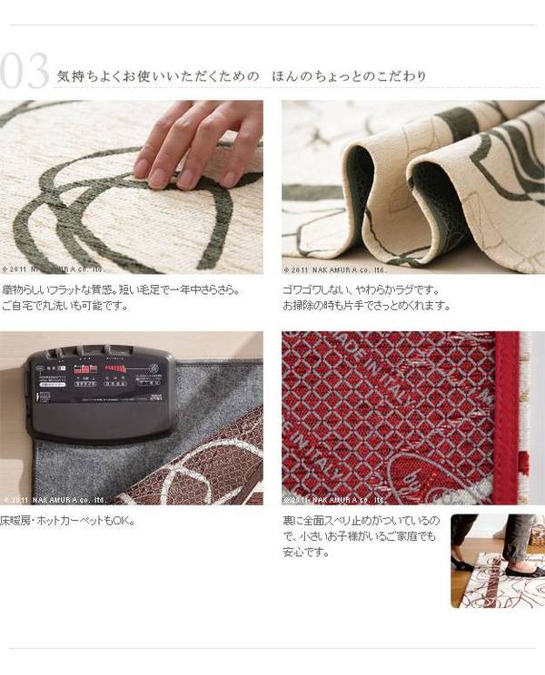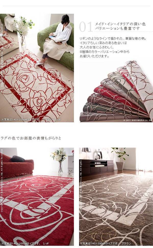 商品について:カメリアが描かれたゴブラン織の上品なやわらかいラグ。全面滑り止め加工でお子様からお年寄りまで足元安心♪洗濯可。床暖房・ホットカーペット対応。