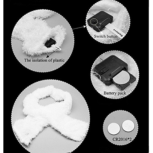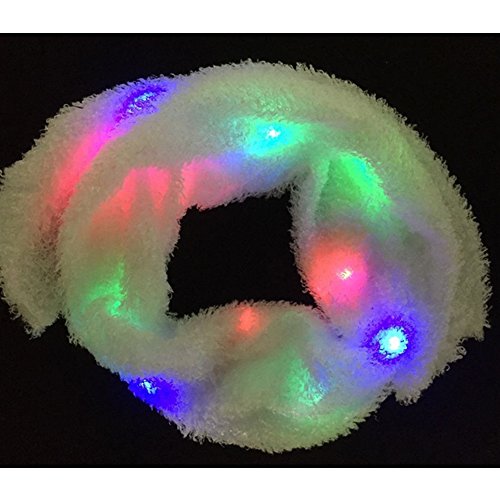 Product Description LED Colorful Flashing Lighting Scarf Light-up Toy Specifications: 1. Battery: 2 piece CR2016 button battery 2. Operation: Press the button 3. Material: Acrylic knitting 4. Color: White 5. Weight: 4.5 ounces Package included: 1 x LED Colorful Flashing Lighting Scarf0