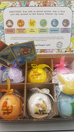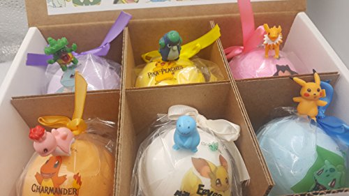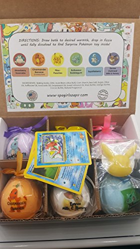 -. Feature : Bath Bombs For Kids With SurP.R.Ise Toys Inside (Pokemon) USA MADE, XL 5 oz bath bomb Gift Set For Girls/Boys / POKEMON Bath Bomb Gift Set with SurP.R.Ise Pokemon Mini-figure inside. Gift Set includes 6 Huge bath bombs, USA Made, Perfect for Spa Bath, Handmade Birthday Gift, Gift idea for Girls and Boys who love Pokemon. / HANDMADE IN THE USA by Spa Girl WITH LOVE. This GIFT SET contains a variety of scents including Pika-Peaches, Strawberry Snorcake, Chamander Bananer, Squirtleberry, Bulbasaur Bubblegum, Eevee Hugs and others great scents kids will love / MADE WITH NATURAL AND ORGANIC INGREDIENTS - Our bath bombs are safe for kids, include natural ingredients, and will leave their skin feeling hydrated and moisturized. All ingredients are KID SAFE, Some toys "surP.R.Ises" not intended for Children under 3. / 99-100% NATURAL BATH BOMBS THAT WON'T STAIN YOUR TUB, FUN for any age, Money Back Guarantee