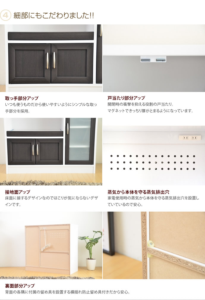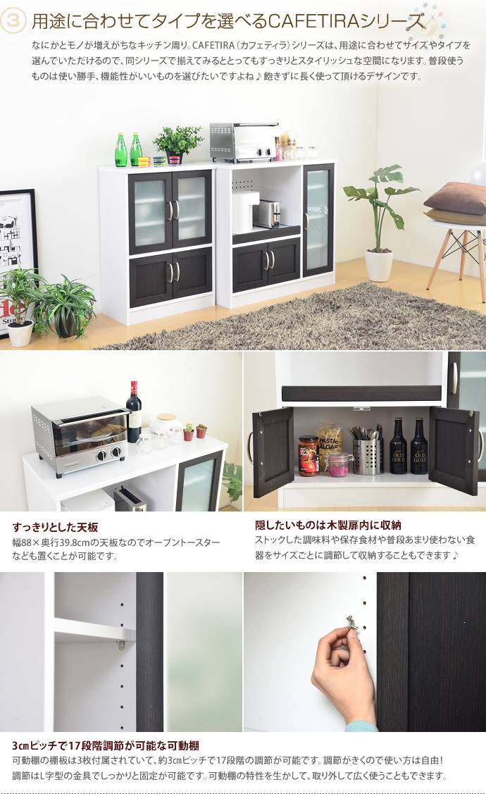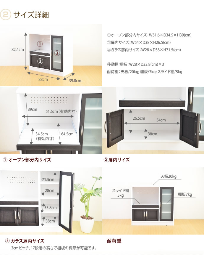 | サイズ | 本体サイズ:W880×D398×HH824(mm) オープン部分内寸:W516×D345×H389(mm) 扉部分内寸:W541×D356×H265(mm) ガラス扉部分内寸:W282×D356×H712(mm) 棚板:W281×D337(mm)×3 耐荷重:天板/20kg; 棚板/7kg; スライド棚/5kg |