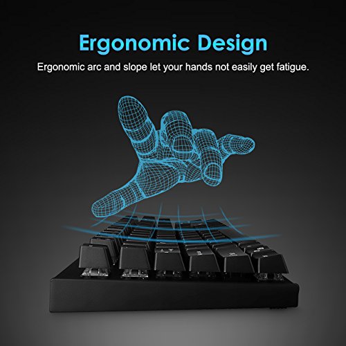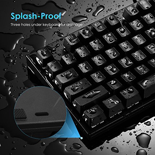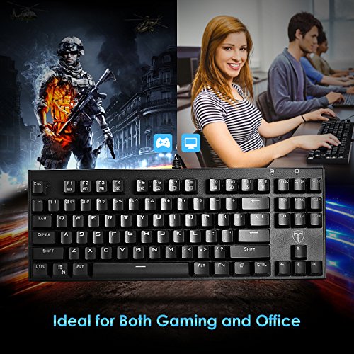 -. Feature : Blue Switches.Provide your clicky ± tactile feedback to improve typing speed and accuracy. Give you an edge over gaming competitors with accurate response. And it also owns the most rhythmic clicky feeling of typing among all kinds of switches(Blue/Red/Black/White/Brown Switch).50,000,000 times keystroke test, 60 ±15g key force and 4.0 ± 0.2mm stroke travel. / Anti-ghosting,87 Non-Conflicting Keys. This Mechanical Gaming Keyboard allows multi-keys to work simultaneously without confliction, experiencing a new level of gaming and typing. Ideals for gamers, typist, programmer, writer etc. / Build Quality. Made of top-grade ABS and metal base, with matte-finish texture,it is sturdy and robust for durability. Laser-engraved keys are not easy to fade. Water-resistant with drain holes. / FN Shortcuts. Easily access to media controls, such as play, pause, next and previous track, calculator, email, web browser etc without exiting game. / Ergonomic Design and Wide Compatibility. Cascading keycap design fits your palm easily to prevent fatigue. Suitable for Windows10, Windows8, Windows 7, Windows XP, Windows VISTA etc. Backed by 45 days money-back and 12-month worry-free warranty